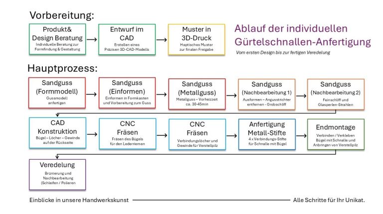Du bekommst bei uns keine Standardschnalle. Du bekommst ein Einzelstück, das wir von der ersten Idee bis zur fertigen Oberfläche komplett selbst entwickeln und bauen.